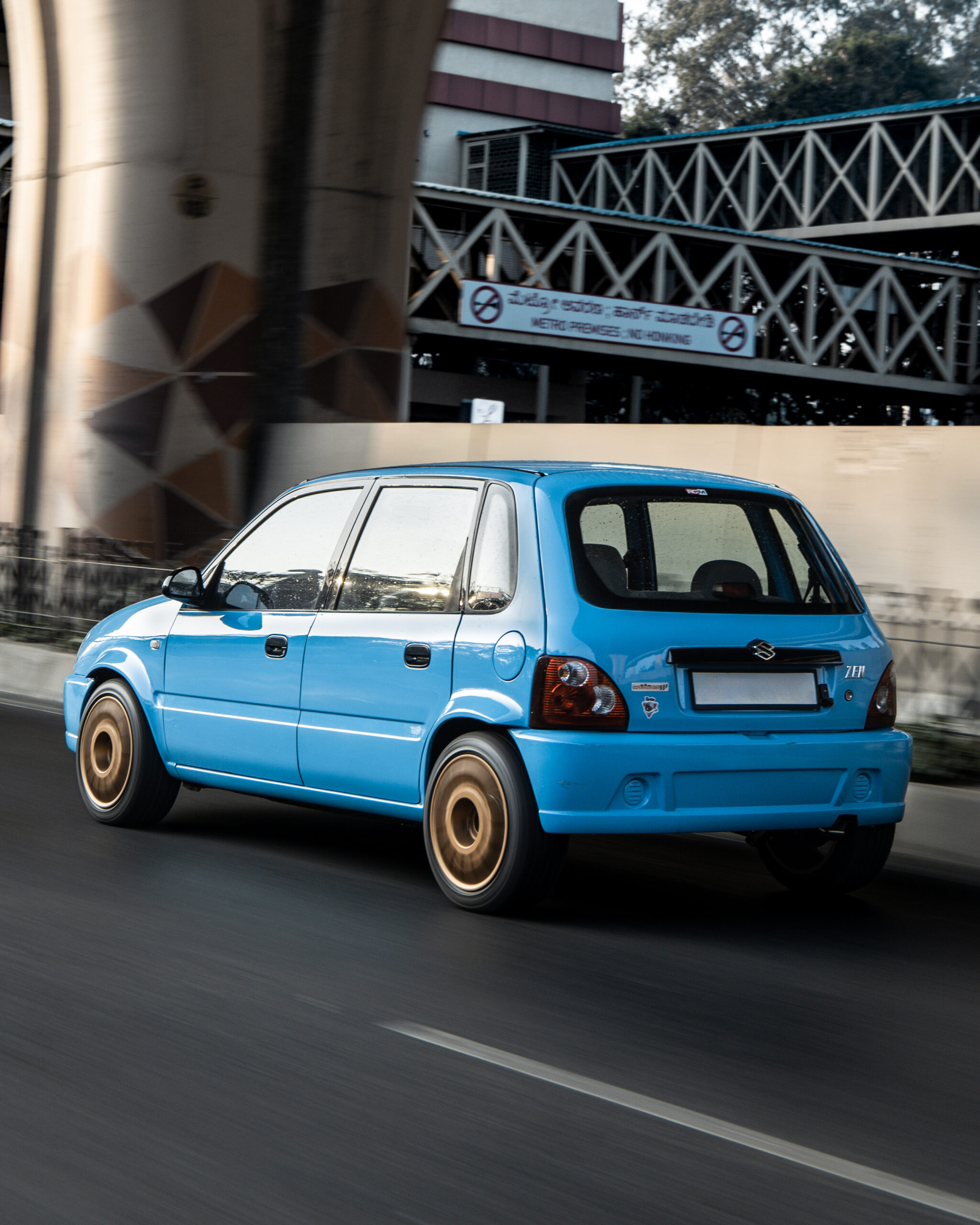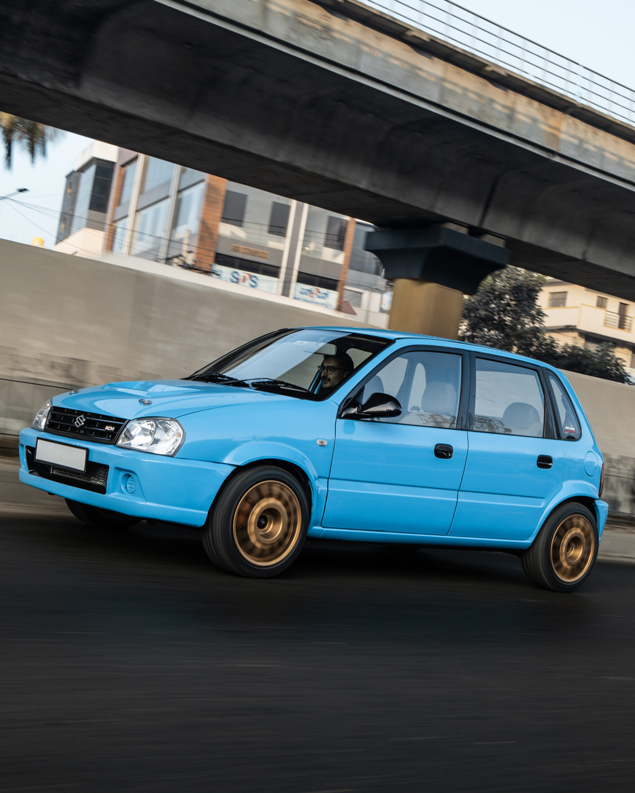 Finished in Porsche Miami Blue, this Zen looks nothing like the polite hatchback most of us grew up seeing. It sits wide and aggressive with flared arches at the front and rear, 15 inch alloy wheels wrapped in Linglong tyres, upgraded brakes, and a vented hood secured with latches. It looks like a track toy, and it absolutely backs up the visual drama once you open the bonnet.