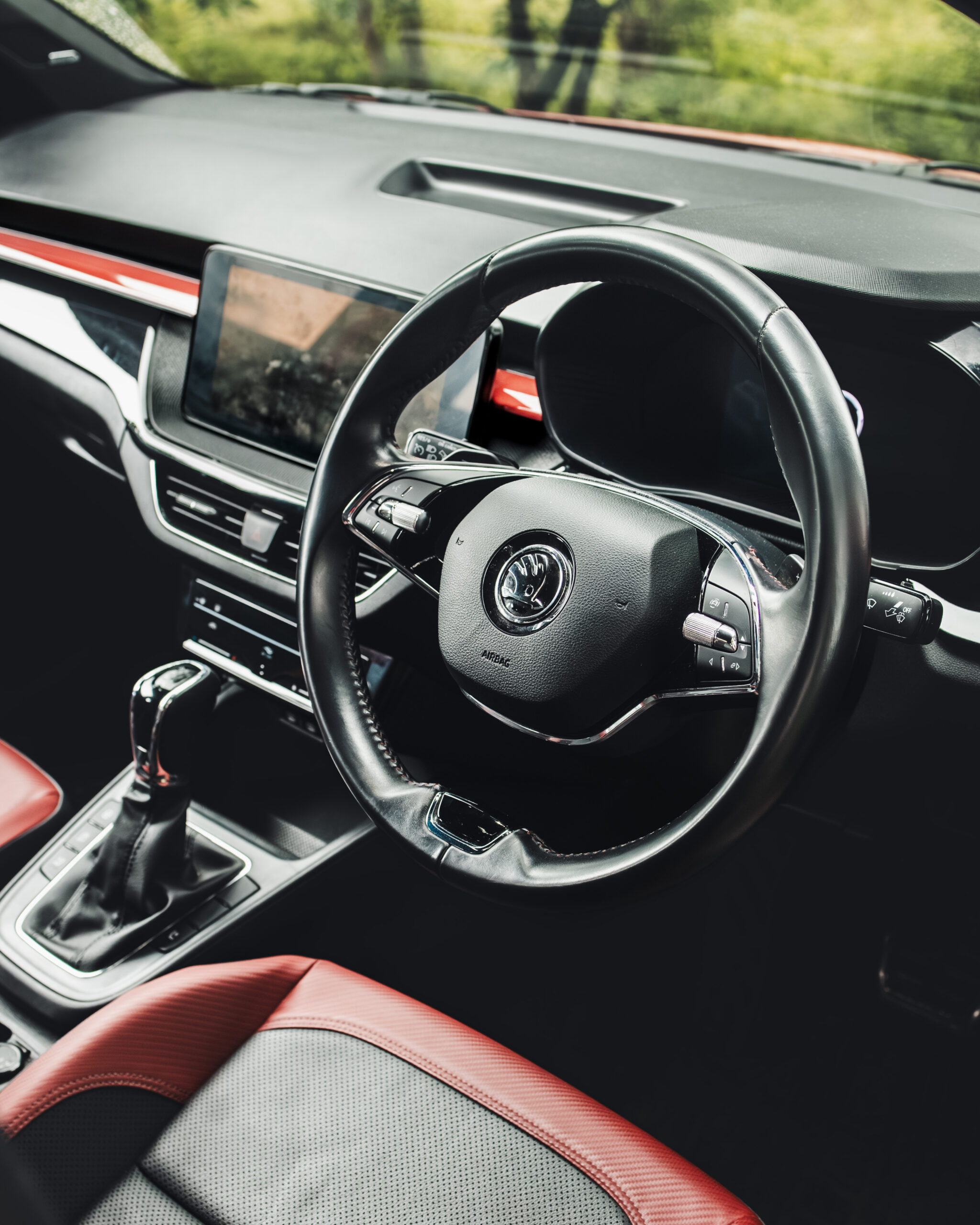 Step inside, and Škoda seems to have gone all out on the “sporty” theme; perhaps a bit too much. The cabin is drenched in red: red leather seats, red dashboard inserts, red stitching. On paper, that sounds exciting, but in reality, it’s more dramatic than dynamic. It doesn’t scream “rally,” it kind of screams “Valentine’s Day edition.” Personally, an all-black cabin would’ve nailed that sporty premium vibe far better. Still, it’s not all show and no substance, because once you start using it, the Monte Carlo redeems itself with features.